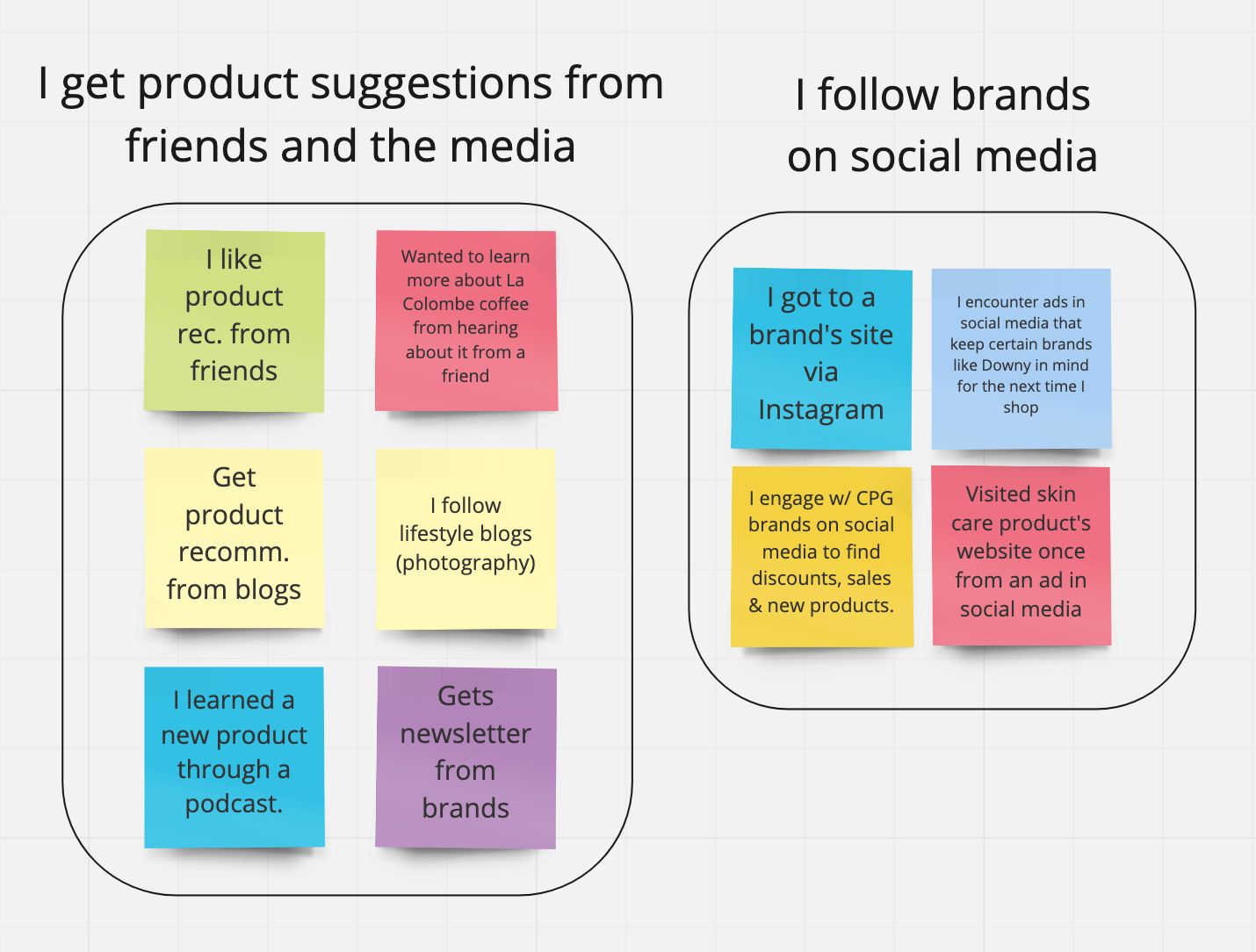 To find patterns and learn from our data we created an affinity map; the most interesting research related to social media and product recommendations. Participants enjoy receiving product recommendations from friends, blogs, even podcasts! Those recommendations frequently lead to a purchase.