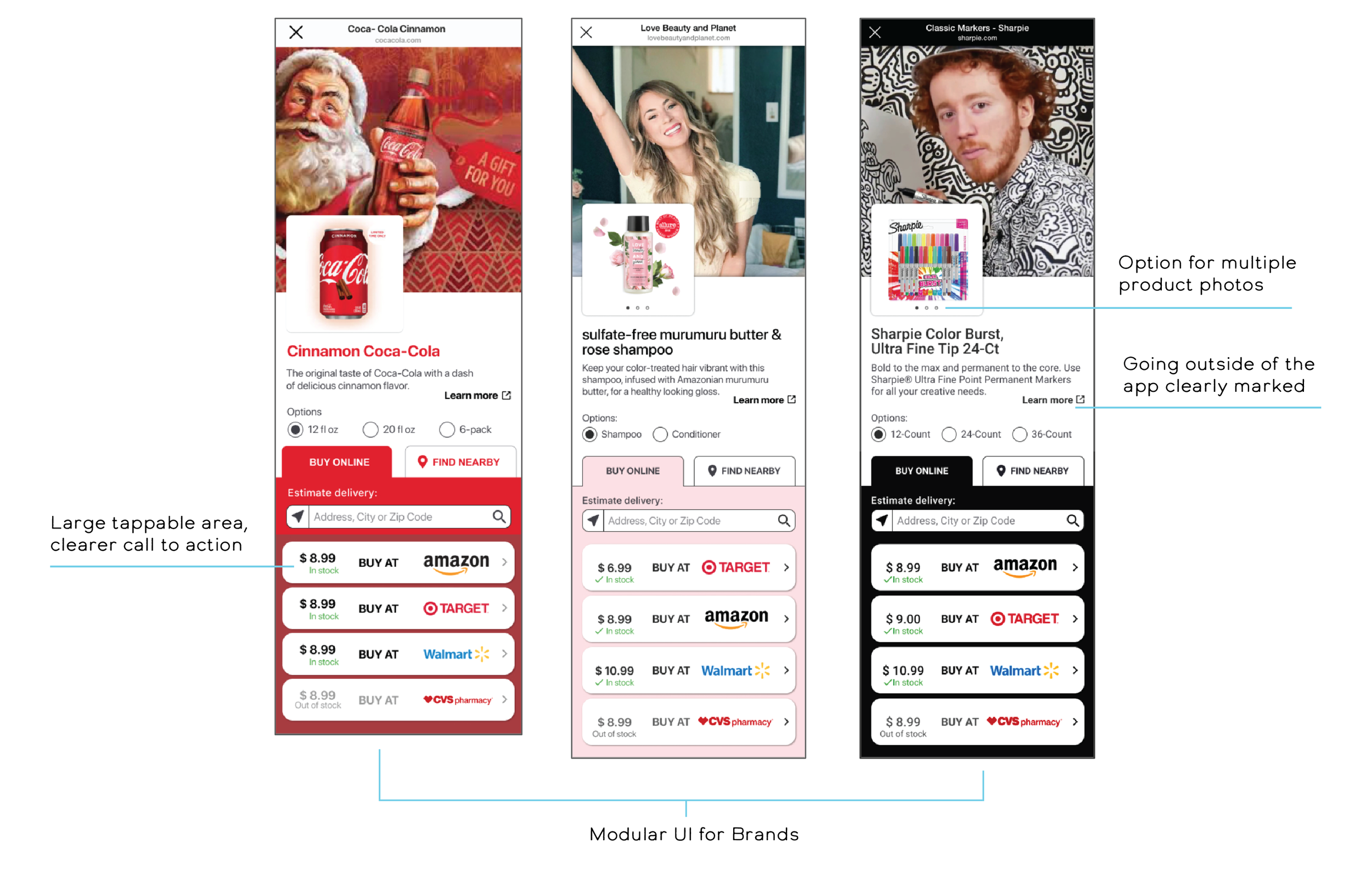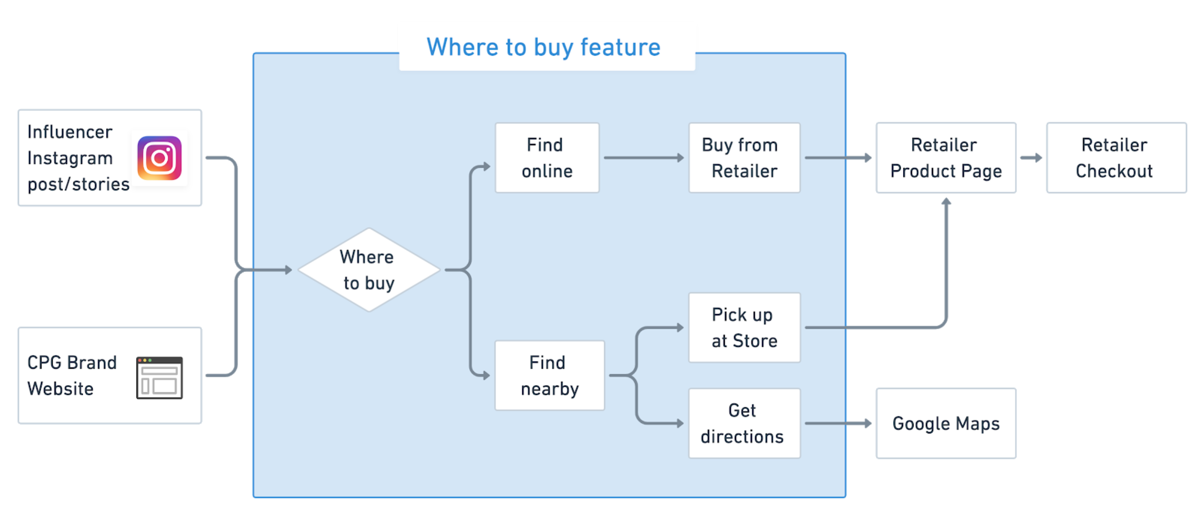 The user can start from either Instagram or a CPG brand website. Our “where to buy” solution guides the user to easily compare in-store and online purchase options. They are then taken directly from the feature to their purchase destination.