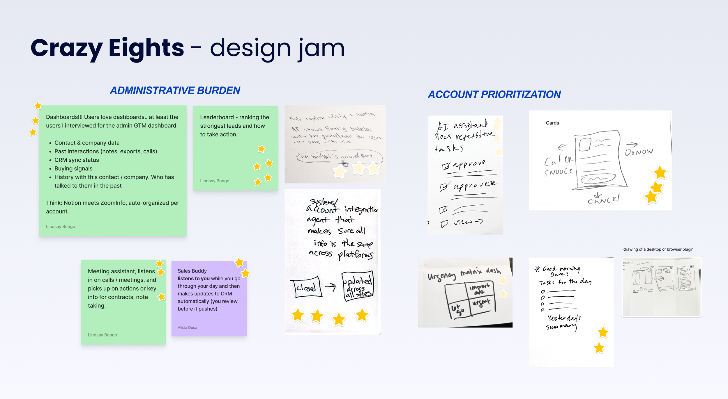 Ideation sessions with the UX Director revealed a clear way to differentiate ourselves by bringing in our CoPilot chatbot! This meeting prep tool idea aligned with frustrations we found in recent user interviews, that Sales AEs and AMs have back to back meetings. Meeting prep takes a lot of bandwidth and time when the information is scattered amongst different applications.